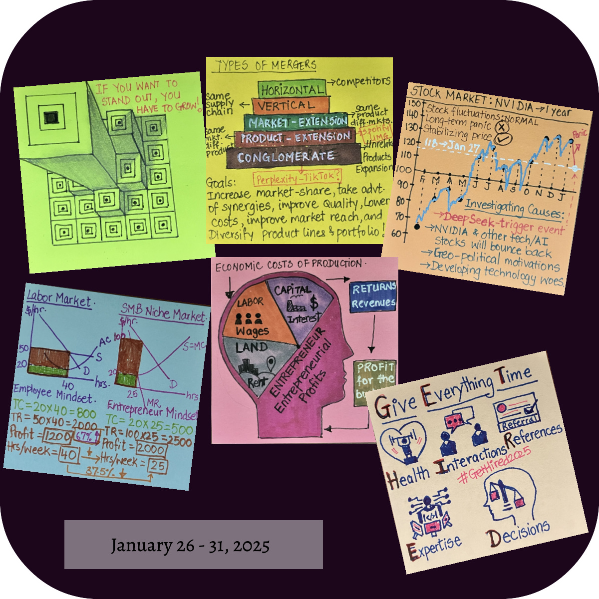Started the week out with a new 3-D style of drawing experiment to show the importance of standing out. Discussed types of mergers on Monday, in the context of various deals being made across the world. Spent the focus on Tuesday discussing the NVIDIA and stock panic. On Wednesday and Thursday, I focused the entrepreneurial mindset and growth.